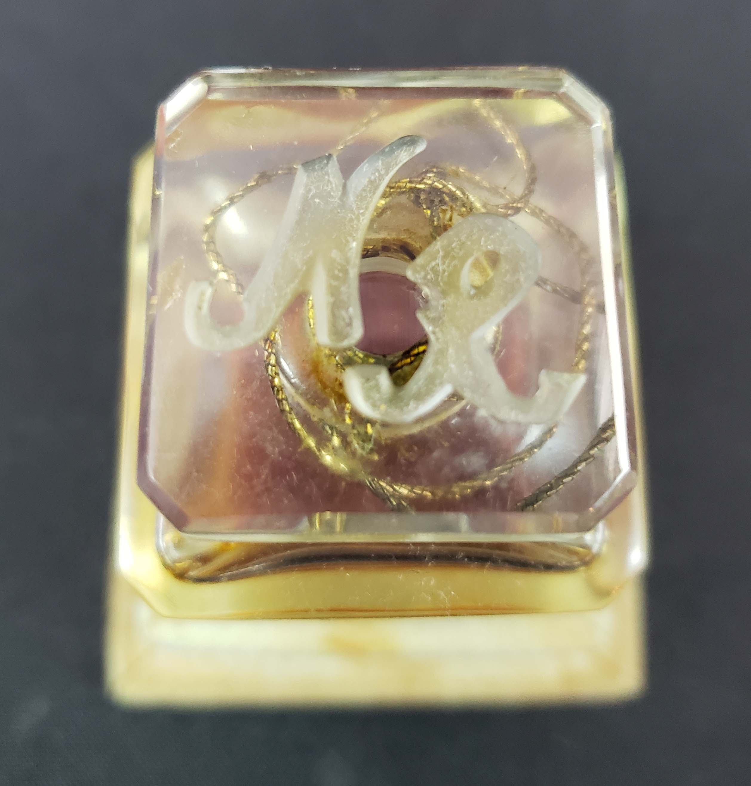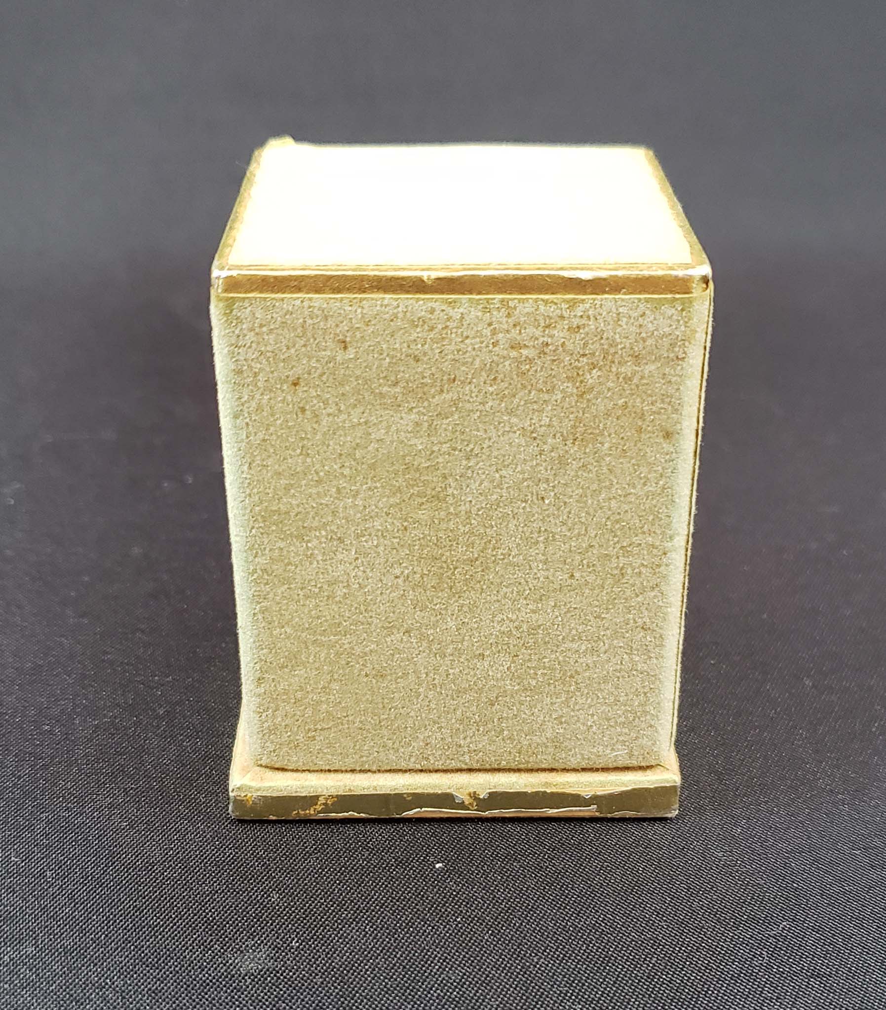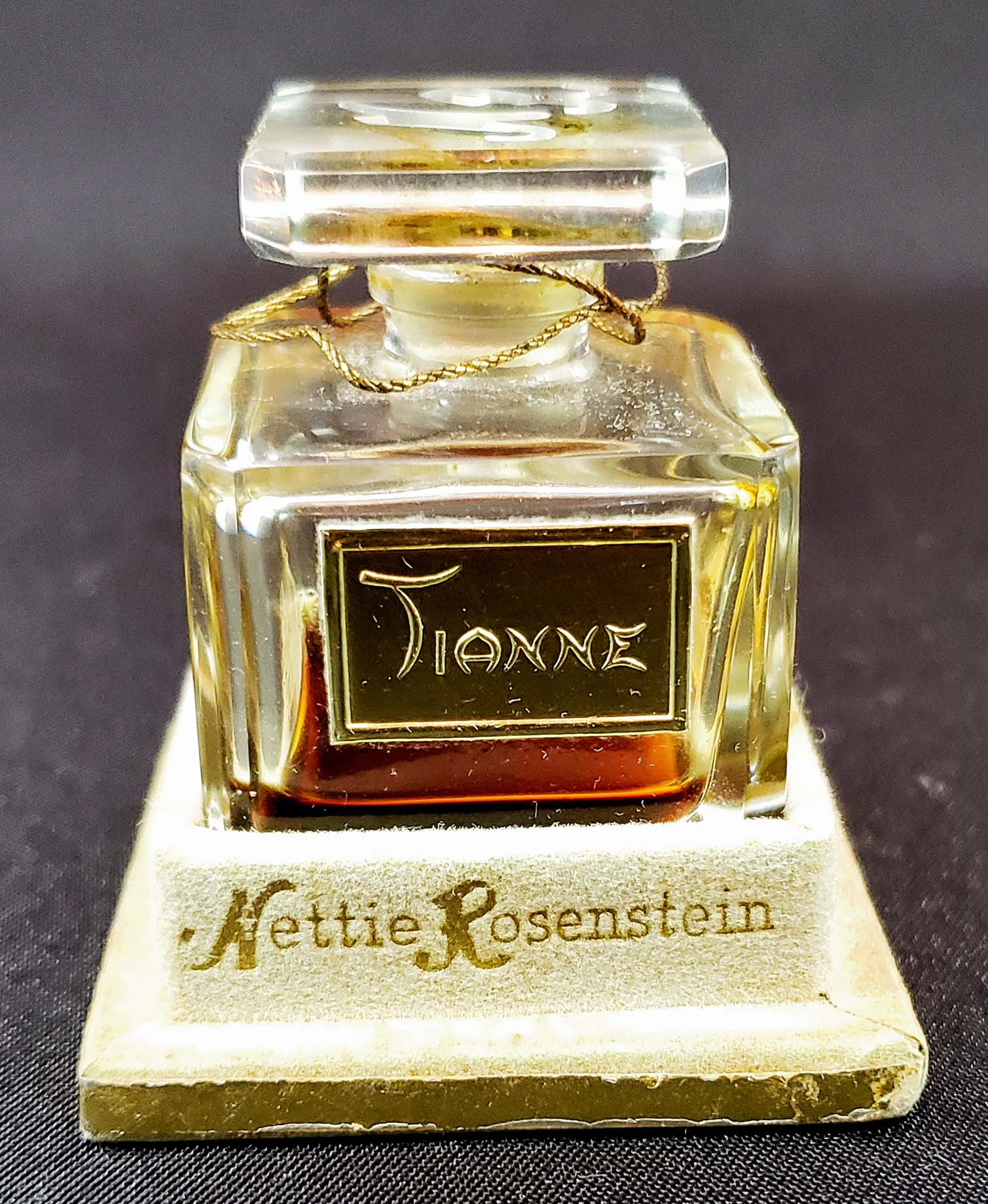 Tianne Perfume by Nettie Rosenstein from the late 1940s. In original box. Finely crafted clear faceted bottle. Initials "NR" in intaglio engraving on the top of the stopper. Box shows light wear. One-half fluid ounce bottle stands 2 inches high; the box is 2 1/2 inches.