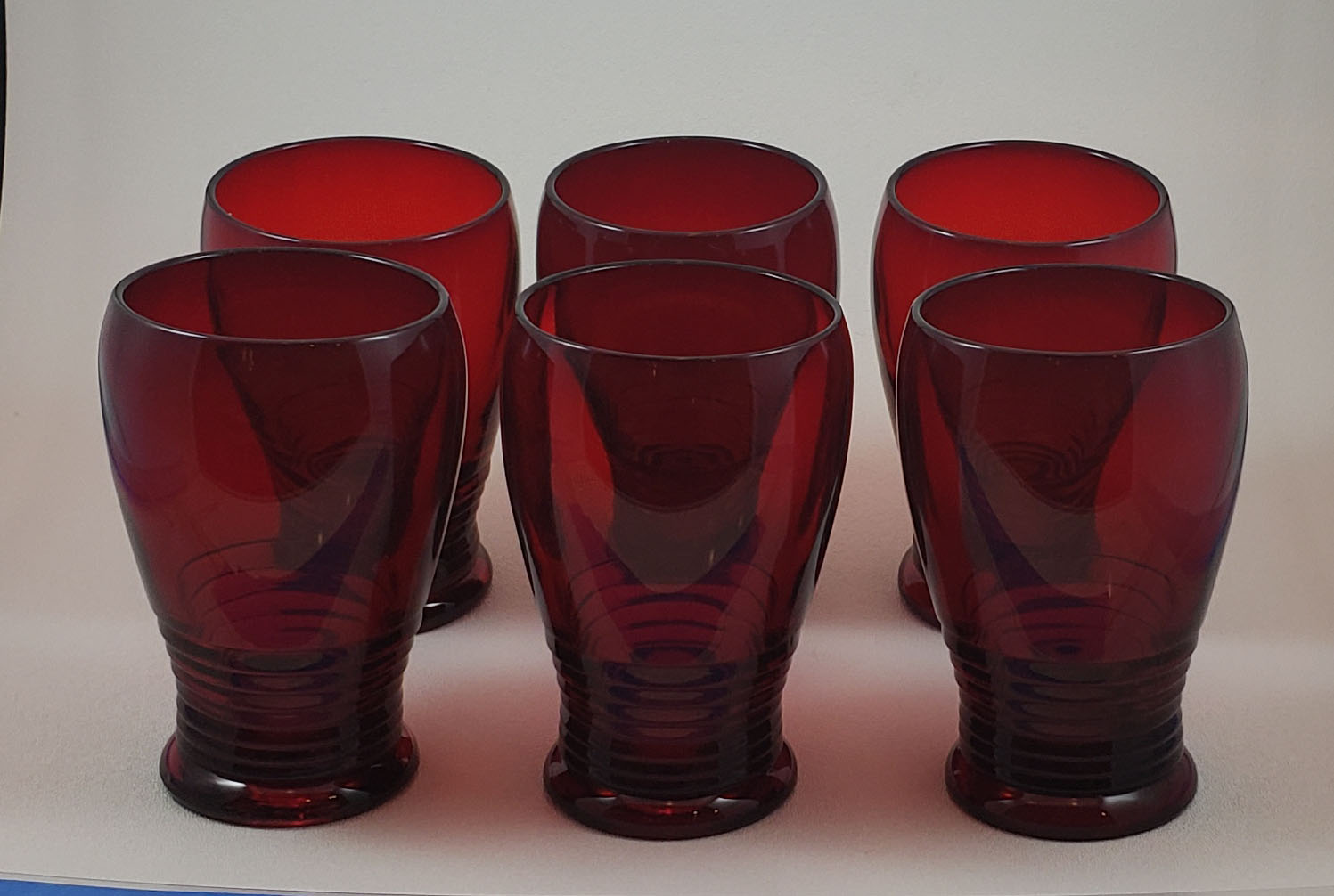 Set of 6 Cambridge Glass Company 10 oz. tumblers in Cambridge's Tally-ho Pattern from the 1930s, in a deep, rich red color named Carmen. Great for elegant or casual entertaining year-round, but especially during the Christmas season! All six are in excellent condition with no chips or scratches. ... (more)