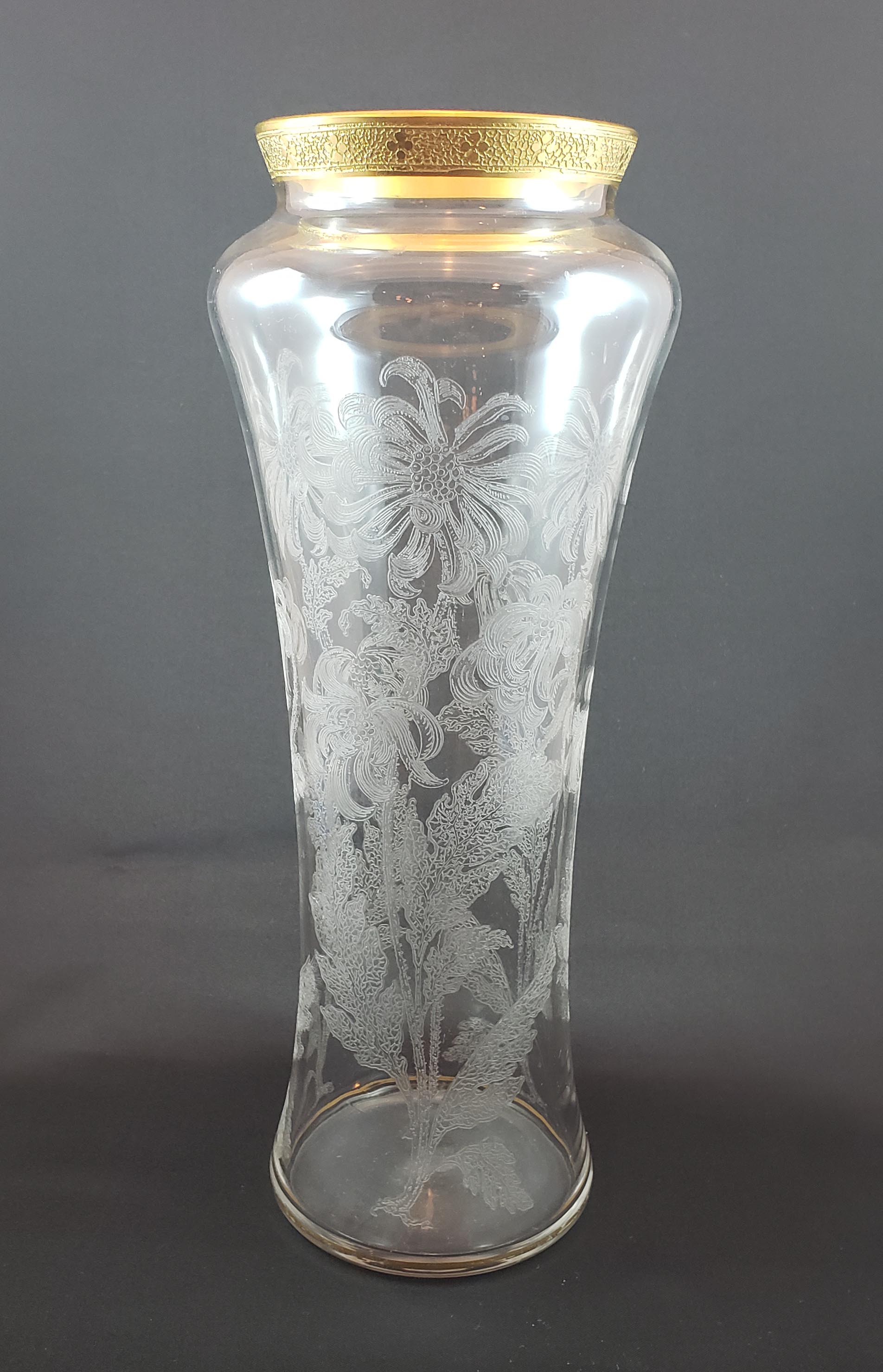 Cambridge Glass Company tall 12" Vase in crystal glass with gold encrusted etching at the rim and gold enamel trim at the base. Etched Chrysanthemum. Width at the top is 8 inches. This vase is circa 1920 and appears the Welker I catalog reprints at page 97. In beautiful condition - gold is near mint - and with no chips, cr... (more)