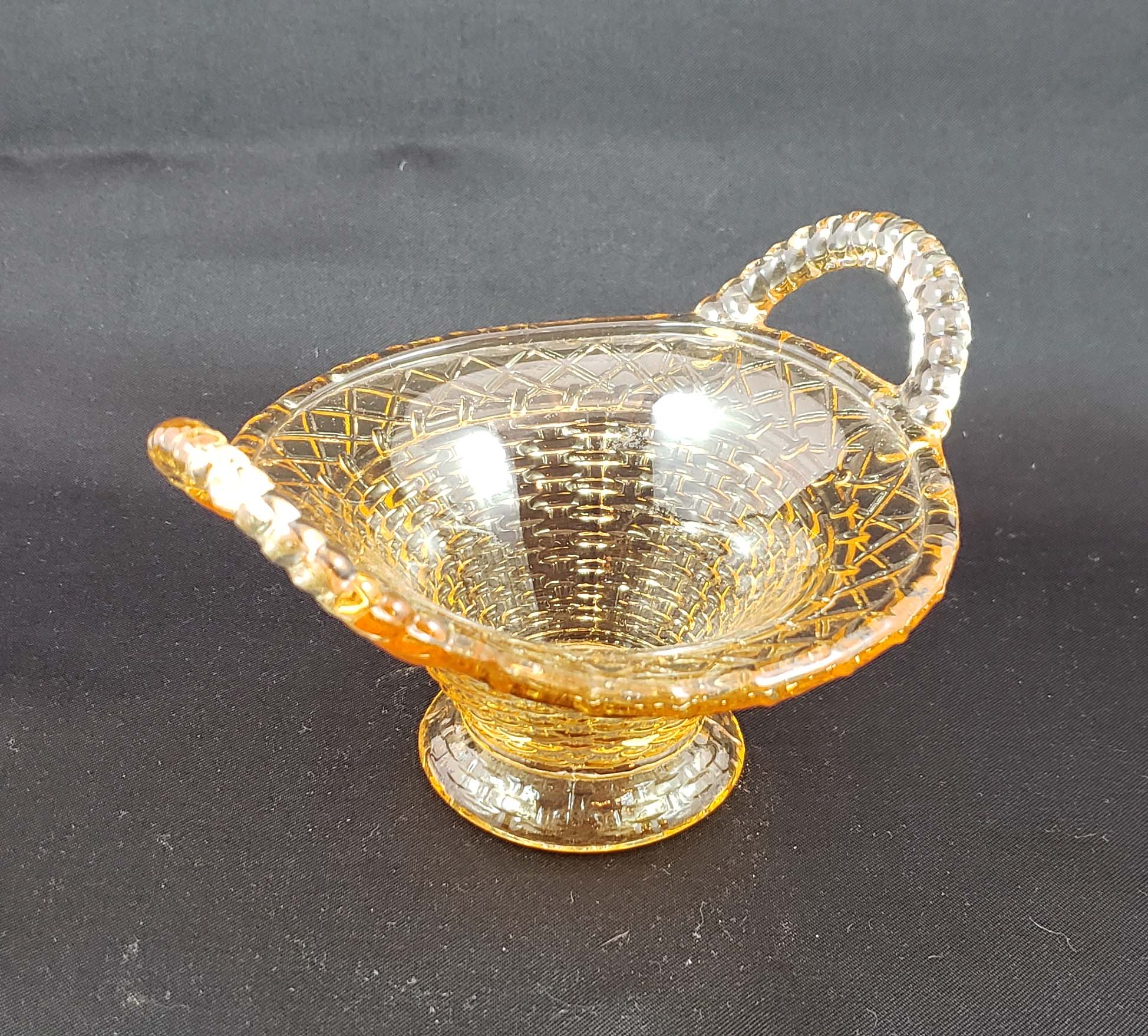 Cambridge Glass Company novelty basket from the 1930's, in a beautiful rich amber glass known by Cambridge as Mocha. The basket is 5 inches to the outside of its handles, and stands 3 inches high. Perfect for a small candy dish or bon-bon server. The basket's glass is beautifully clear and bright, and is in mint condition. ... (more)
