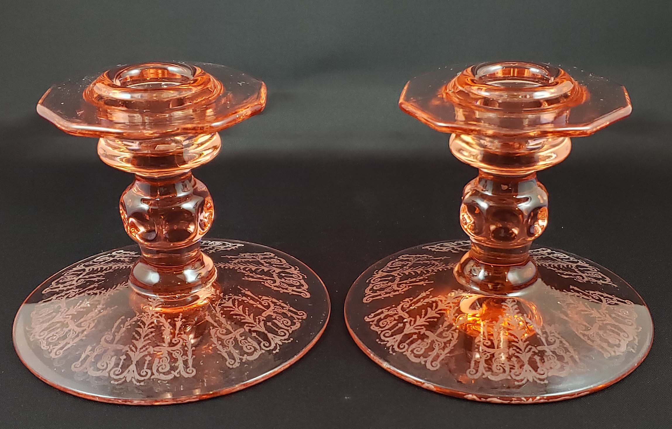 Cambridge Glass Co. Pair of Single Candlesticks Etched Cleo in the Peach Blo (pink) color