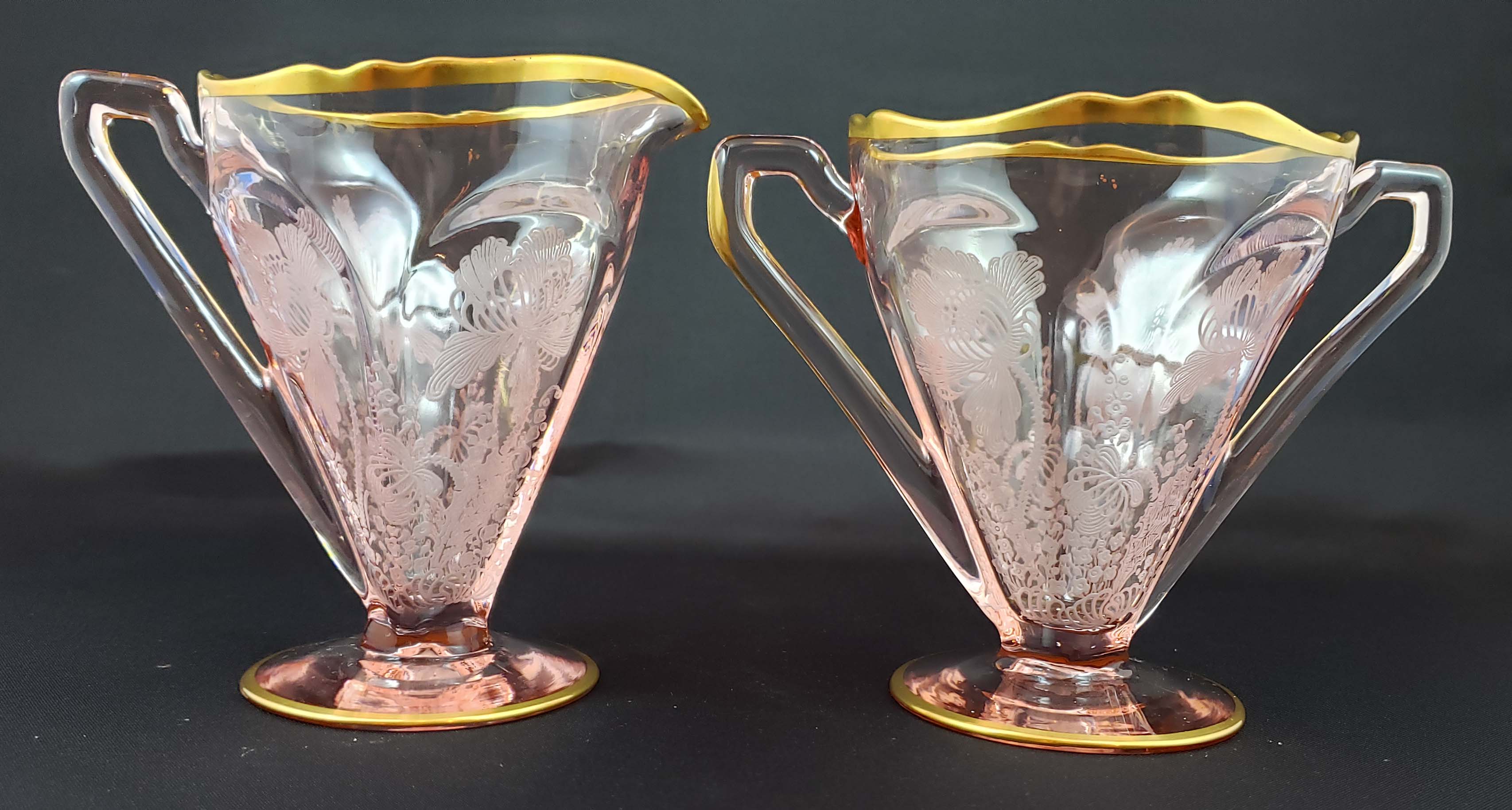 Cambridge Glass Co. Cream & Sugar Set in Peach Blo colored glass etched Gloria