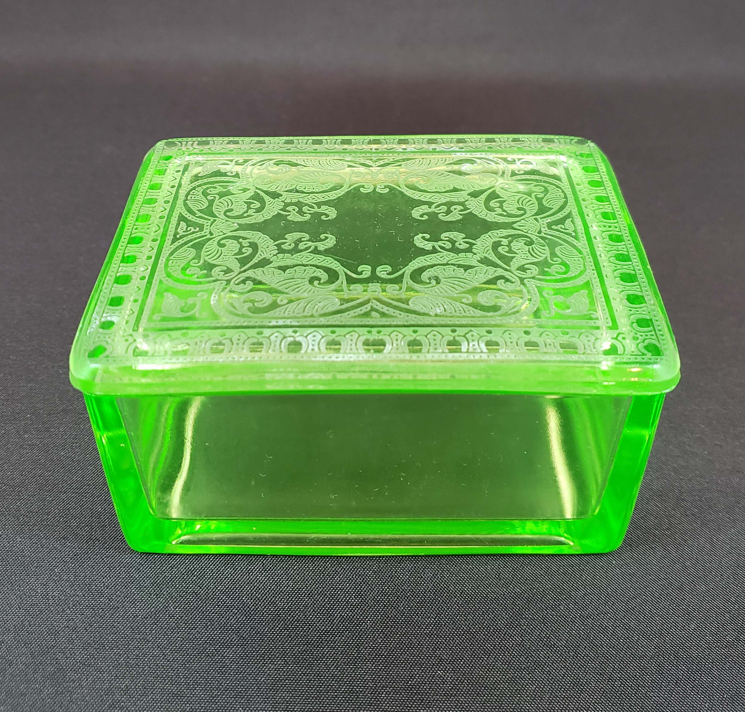 Cambridge Glass Co. Covered Trinket or Cigarette Box - Etched 704 Light Emerald Green 1927