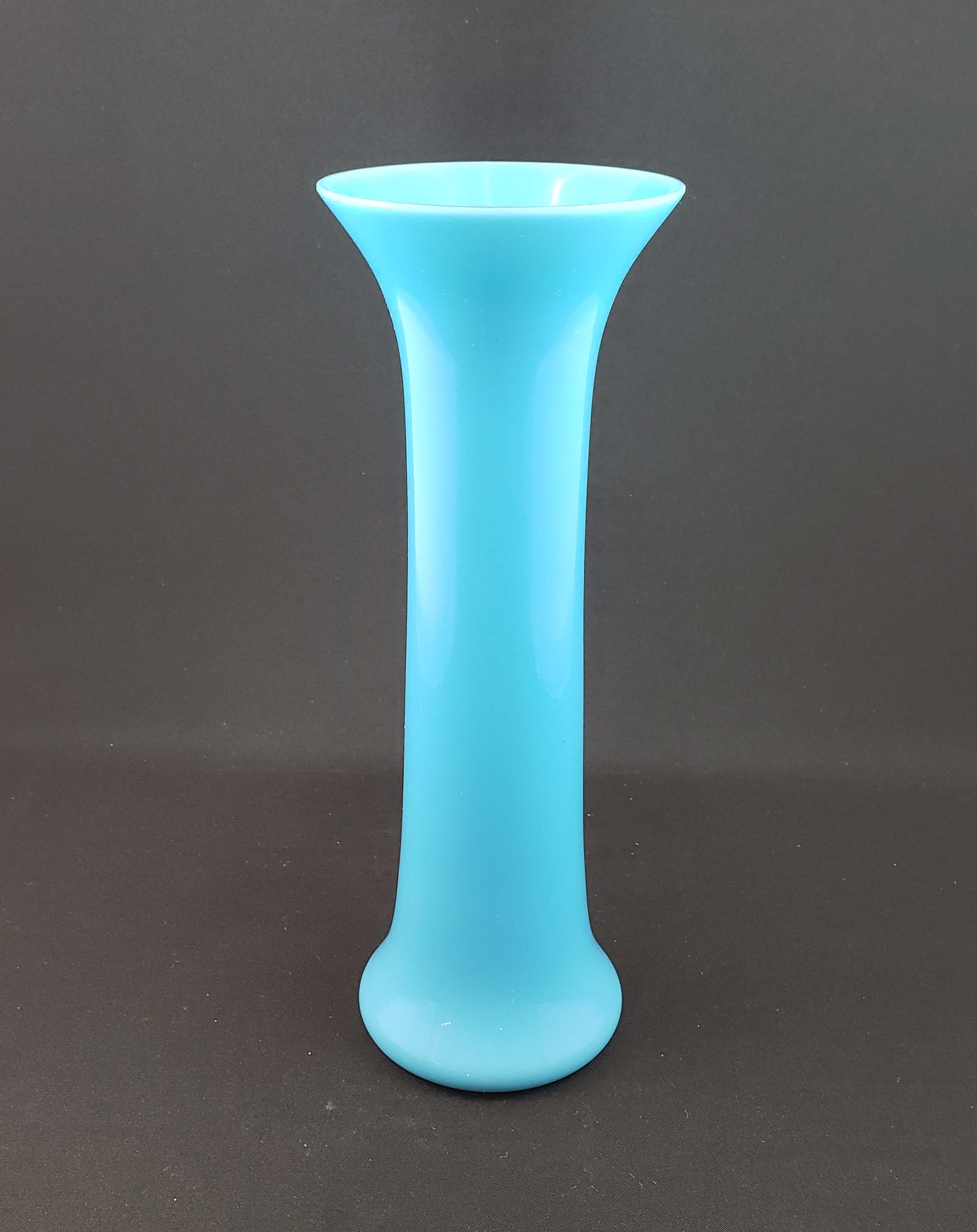 Cambridge Glass Company Azurite paste-mold light blown vase from the early 1920's, in a hard-to-find Cambridge shape 2358. The vase stands 8 1/4 inches tall. Condition is excellent but with extremely small (less than 1/8 inch) and barely visible shallow nick on outside of the rim. The Azurite color is bright and vibrant.... (more)