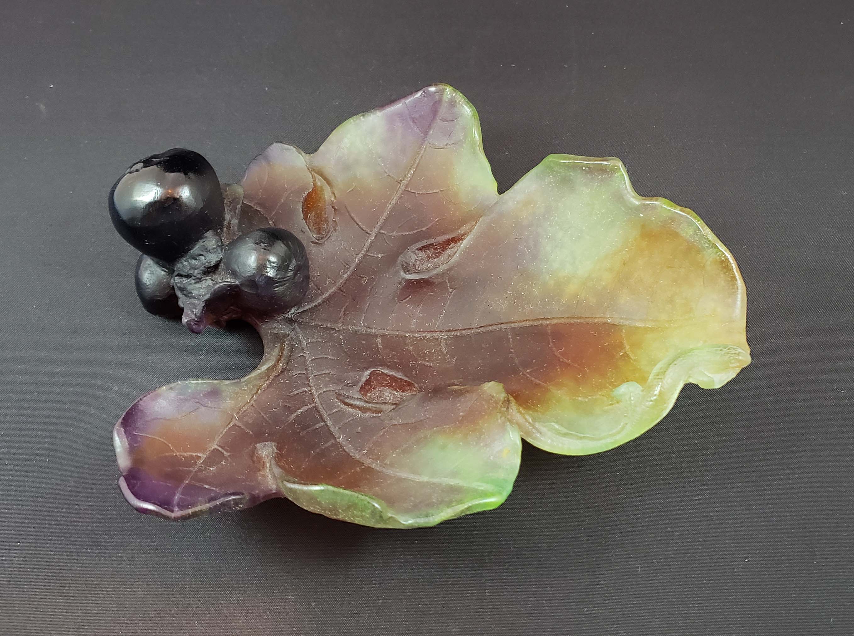 Daum Pate de Verre Art Glass Fig Leaf Dish - Large Size: 8 Inches DAUM PATE DE VERRE ART GLASS FIG LEAF DISH. Offered is a stunning piece from the renowned house of DAUM, French glass masters. This is a beautiful piece rendered in lovey shades of amber, rust, & green. The design is a fig leaf with two figs. It is signed "Daum France" on the bottom. Circa 1980. It is in perfect condition, ... (more) SOLD |