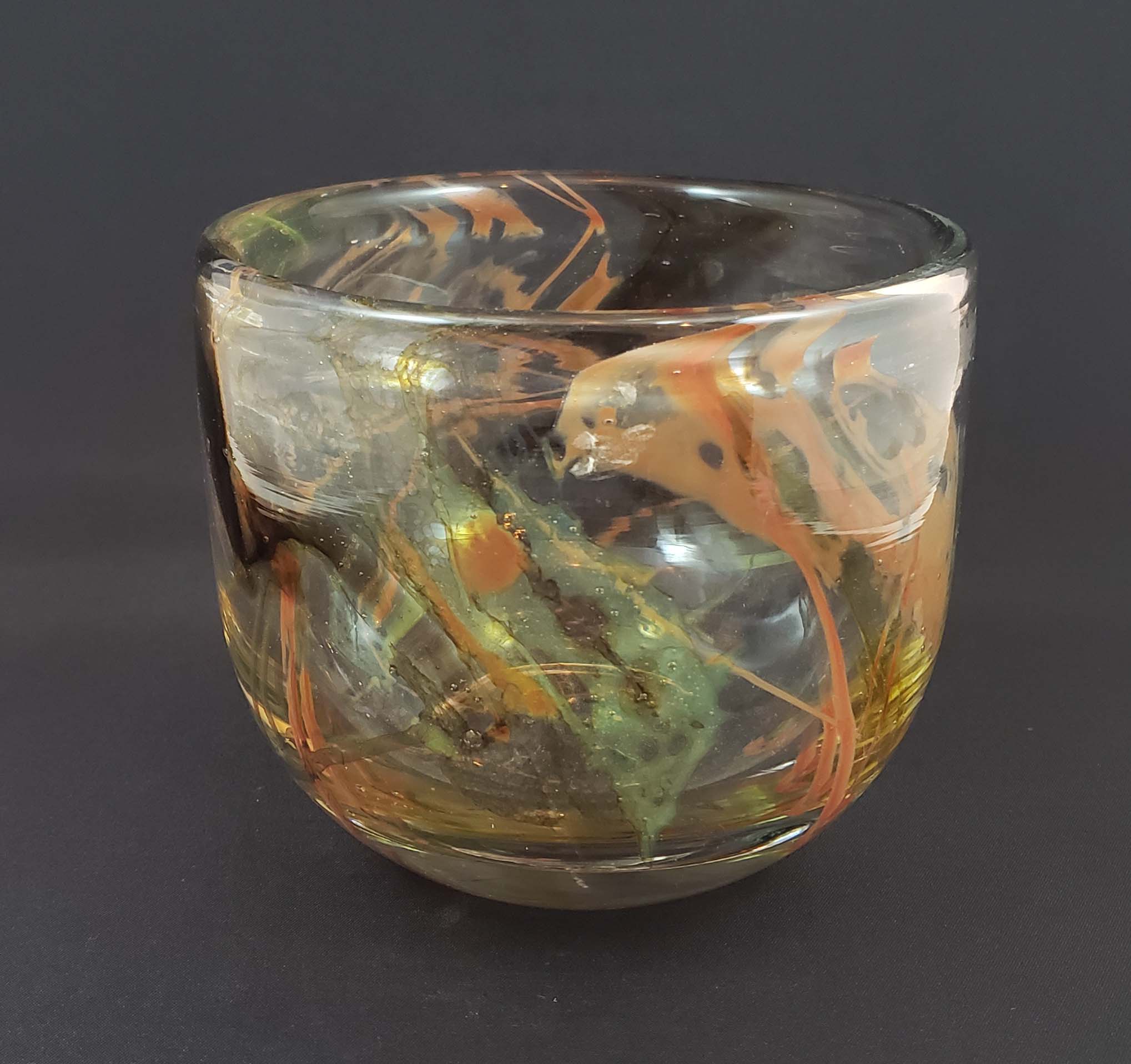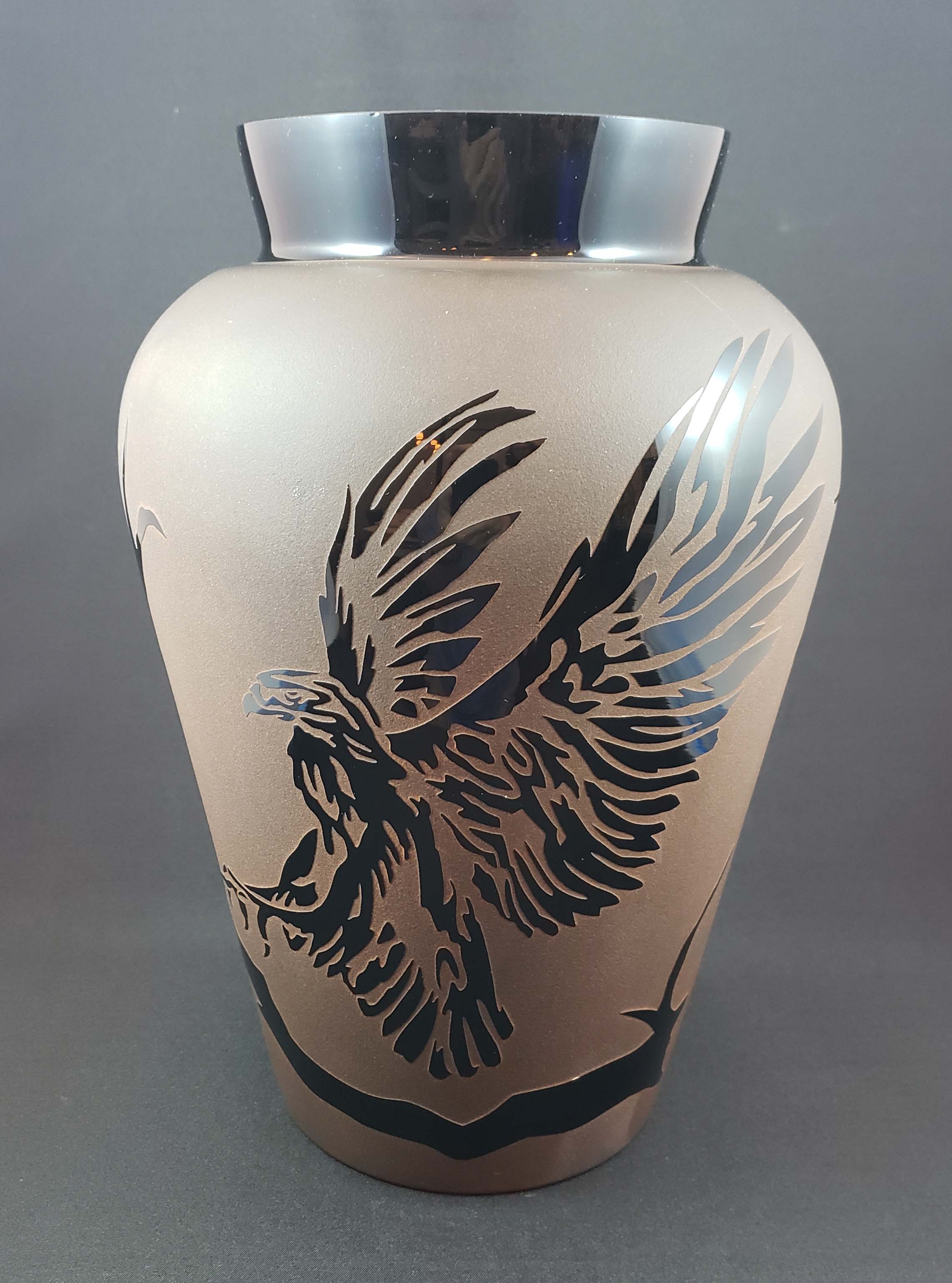 Kelsey Pilgrim Carved Vase Eagle Design 11.5 Inches - Stunning Kelsey/Pilgrim carved glass vase with an eagle and tree decoration in black glass relief against a brown background, by cameo glass artist Kelsey Murphy. Vase is 11.5 inches tall, 5 inches at the top opening and 5 inches at the base. Signed as shown in photo. Excellent condition. ... (more) SOLD |