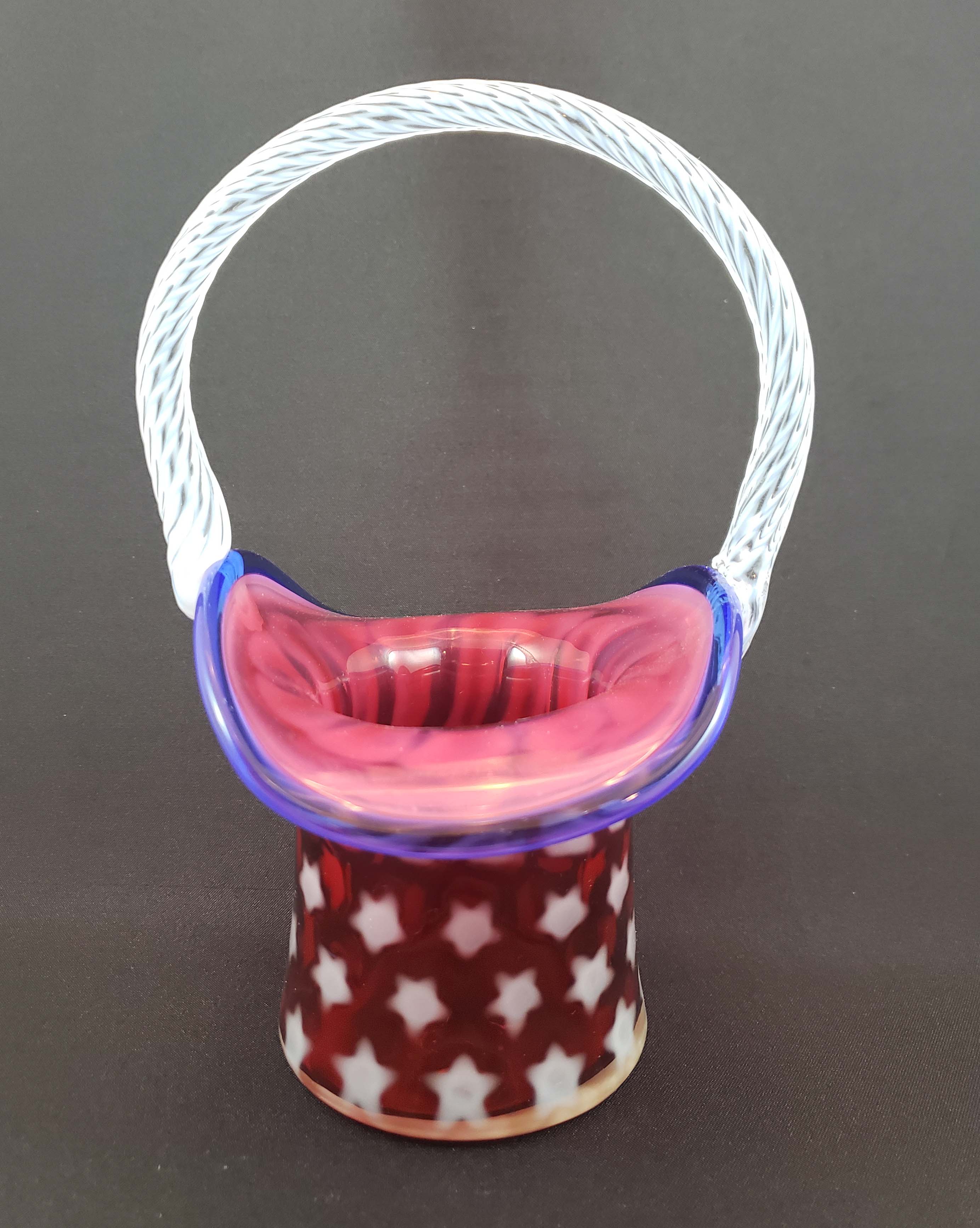 Fenton Handled Basket - Stars and Stripes 2001 - signed Fenton Handled Basket - Patriotic Red, White and Blue glass signed "Stars & Stripes 2001" and marked with Fenton logo signed in the mold on bottom. 7 1/2 inches tall to top of handle. Excellent condition with no chips or scratches. ... (more) SOLD |