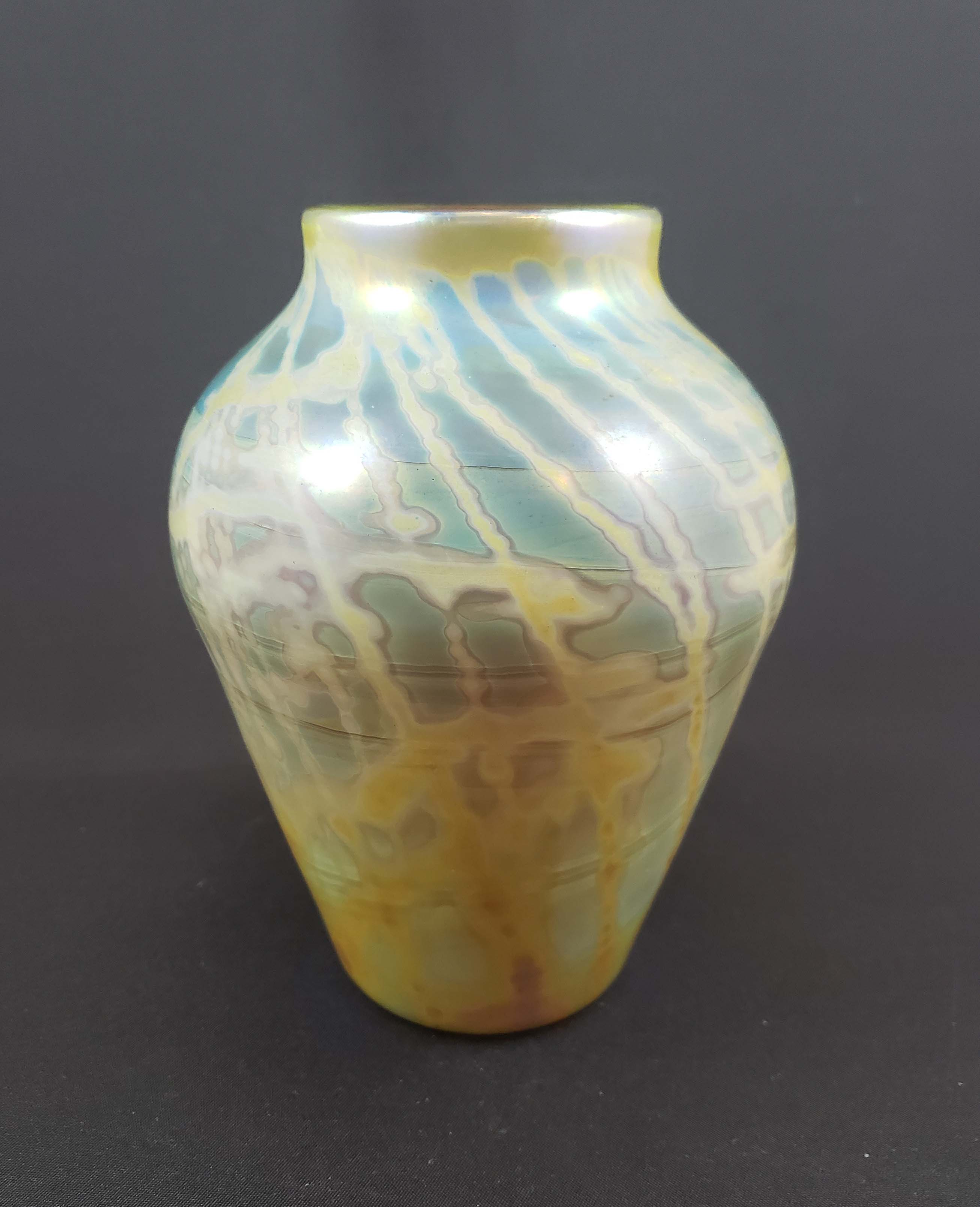 Raymond Correia Signed Art Glass Vase - beautiful opal tones Studio Art Glass Vase by Correia and signed and numbered by Raymond Correia, number V-702-4 from the 1980s. Opalescent and iridized with muted amber and blue tones and pulled lines. Also features a Correia paper label on bottom. Dimensions 6 inches tall and 4 inches at the widest point. Wonderful example of unique studio ar... (more) SOLD |