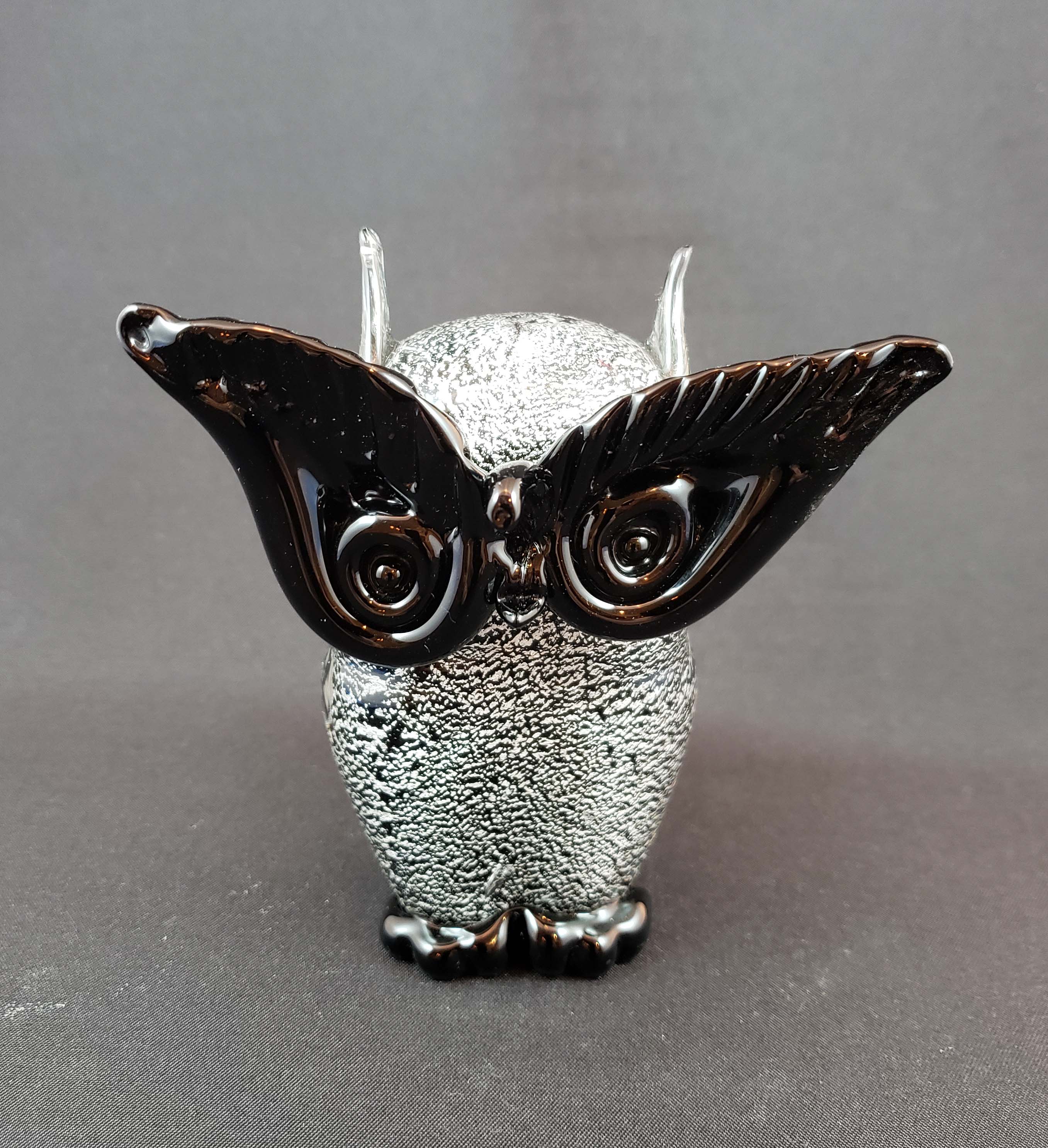 Murano Owl Figurine by Vetreria Artistica Oball - Black and Aventurine Murano Art Glass Owl by Vetreria Artistica Oball Murano Italy art glass studio. Cased clear glass over black Averturine body with black feet and stylized eyes. 4 inches tall. Oball label on bottom. Excellent condition with no issues. ... (more) Price: $95.00 Shipping: $8.00 |