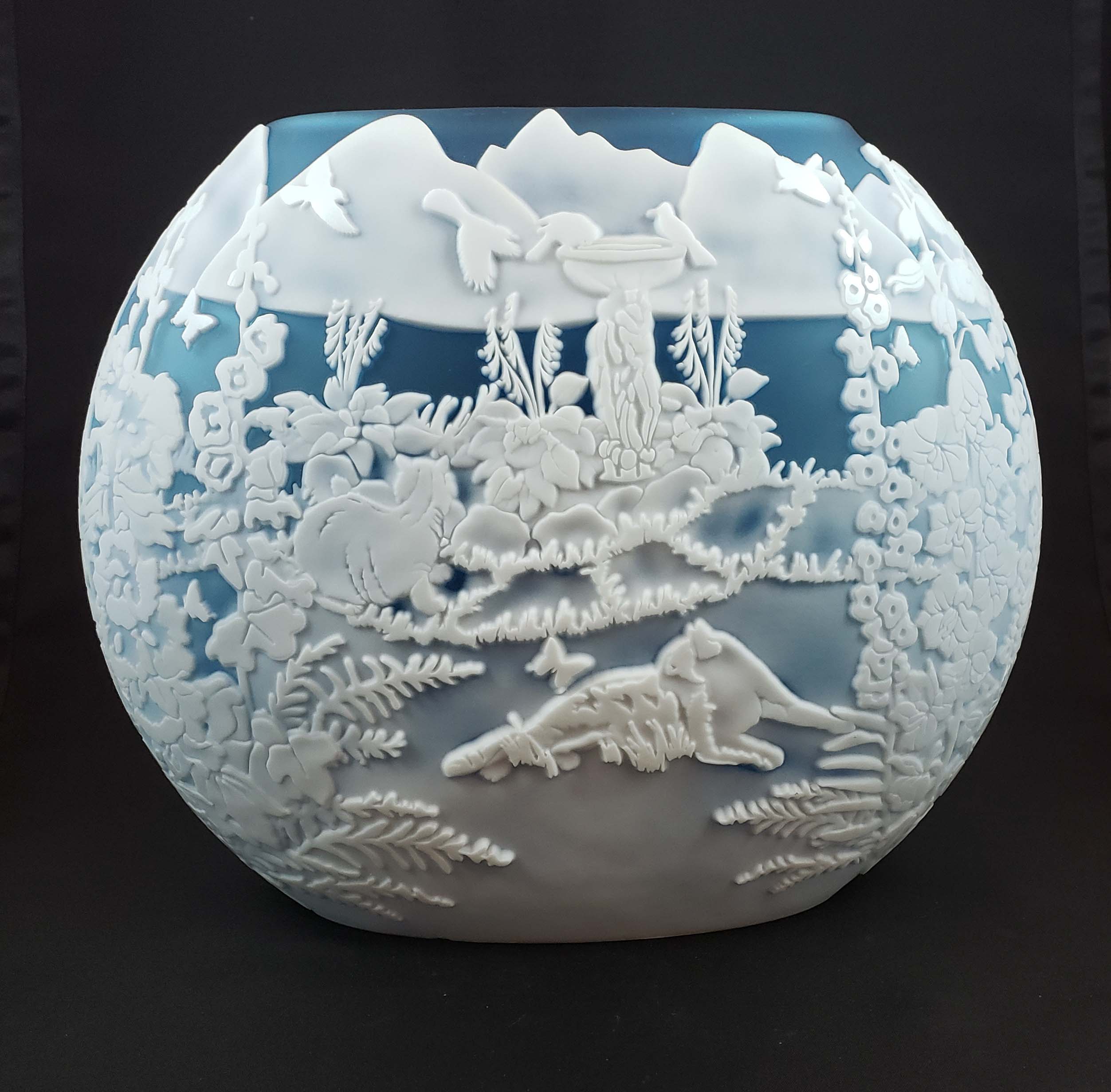 Kelsey Murphy / Bob Bomkamp Fenton Cameo Vase - Feline Frolic - Monumental/RARE This is an exceptionally beautiful and VERY RARE Cameo Glass vase produced at the Fenton Art Glass Company, by famed cameo glass artists Kelsey Murphy and Robert Bomkamp in 2009. It was Fenton's flagship cameo offering for that year. ONLY 25 WERE MADE - this is #6 of 25. Entitled "Feline Frolic", it features an elaborate fa... (more) SOLD |