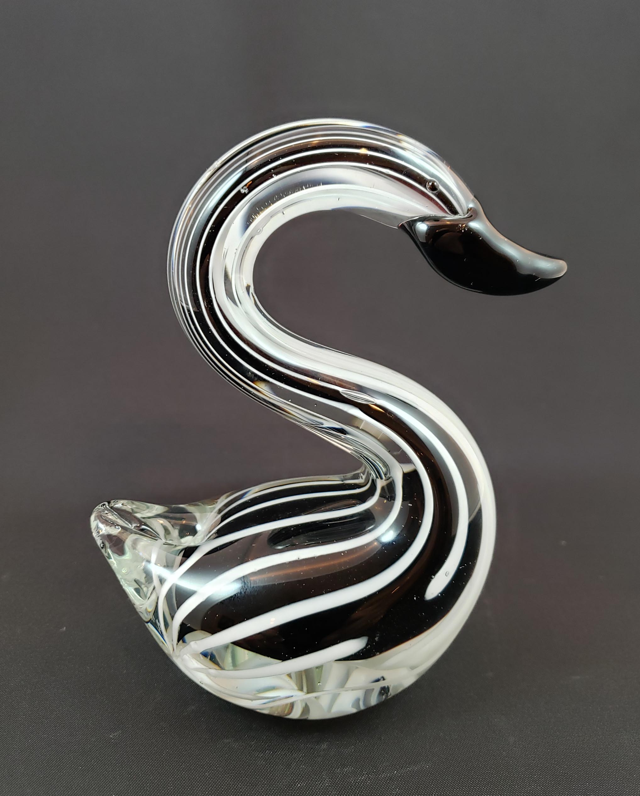 Murano Glass Swan Figural - Clear glass over black with white stripes Murano Glass Swan Figural - Clear glass cased over black with white stripes and a black bill. 5 1/2 inches tall by 3 1/2 inches wide. One small rough spot on the top of the neck as shown. Otherwise in excellent condition. ... (more) Price: $35.00 Shipping: $8.00 |