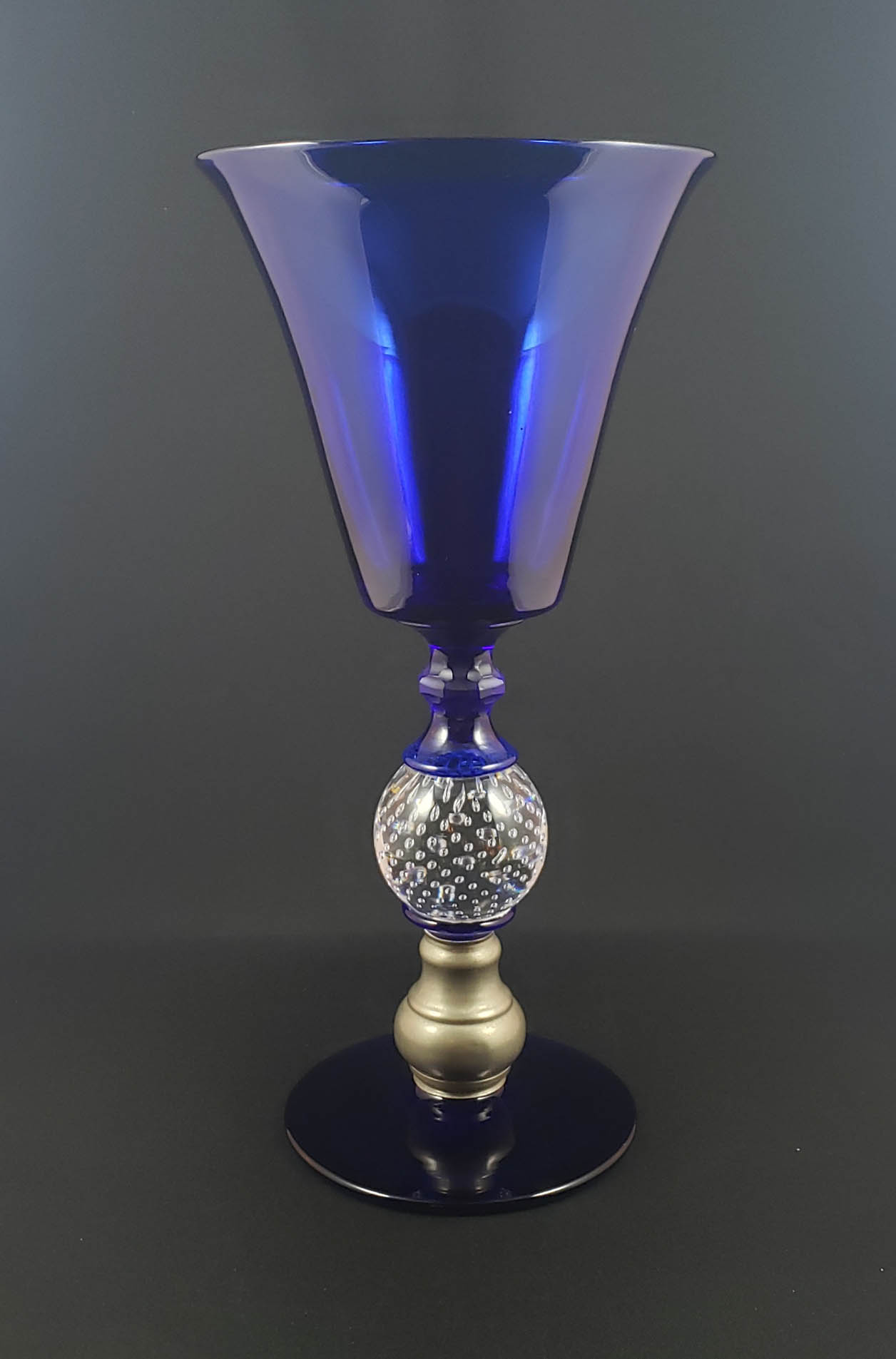 Pairpoint Chalice Vase - Cobalt with Pewter Connector - Fine Arts Line Pairpoint Chalice Vase - Rich Cobalt Blue Glass with Pewter Connector, from Pairpoint's rare Fine Arts Line circa 1930. The vase is 12 1/2 inches tall, 6 1/4 inches across the top and 4 3/4 inches across the foot. Controlled bubble connector. Engraving on the top connector and the bottom of the foot. In excellent condition ... (more) SOLD |